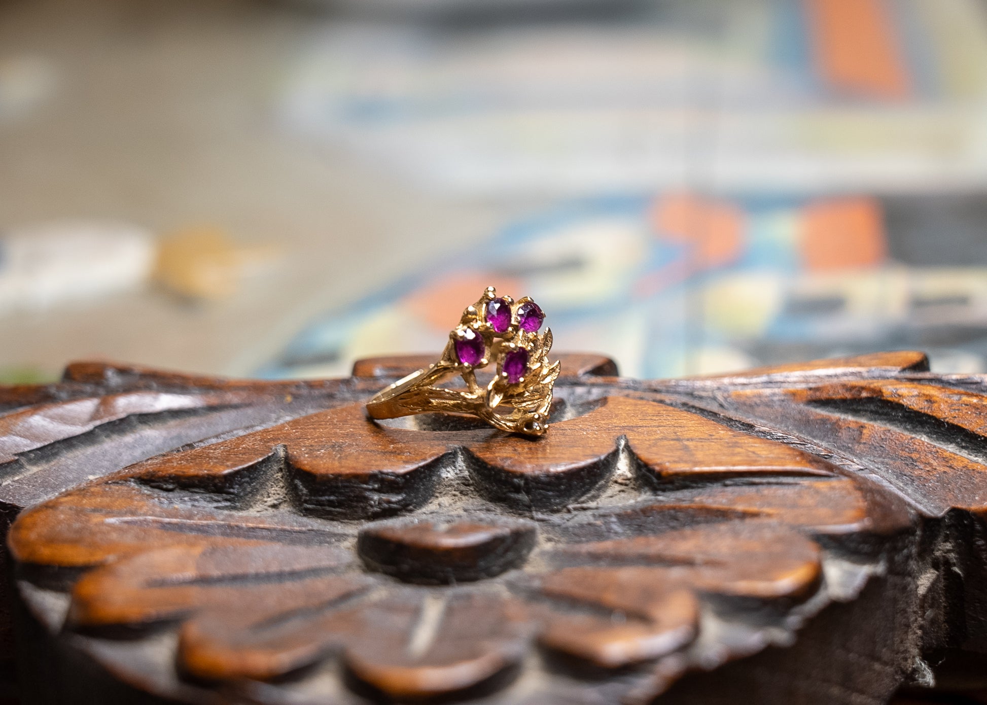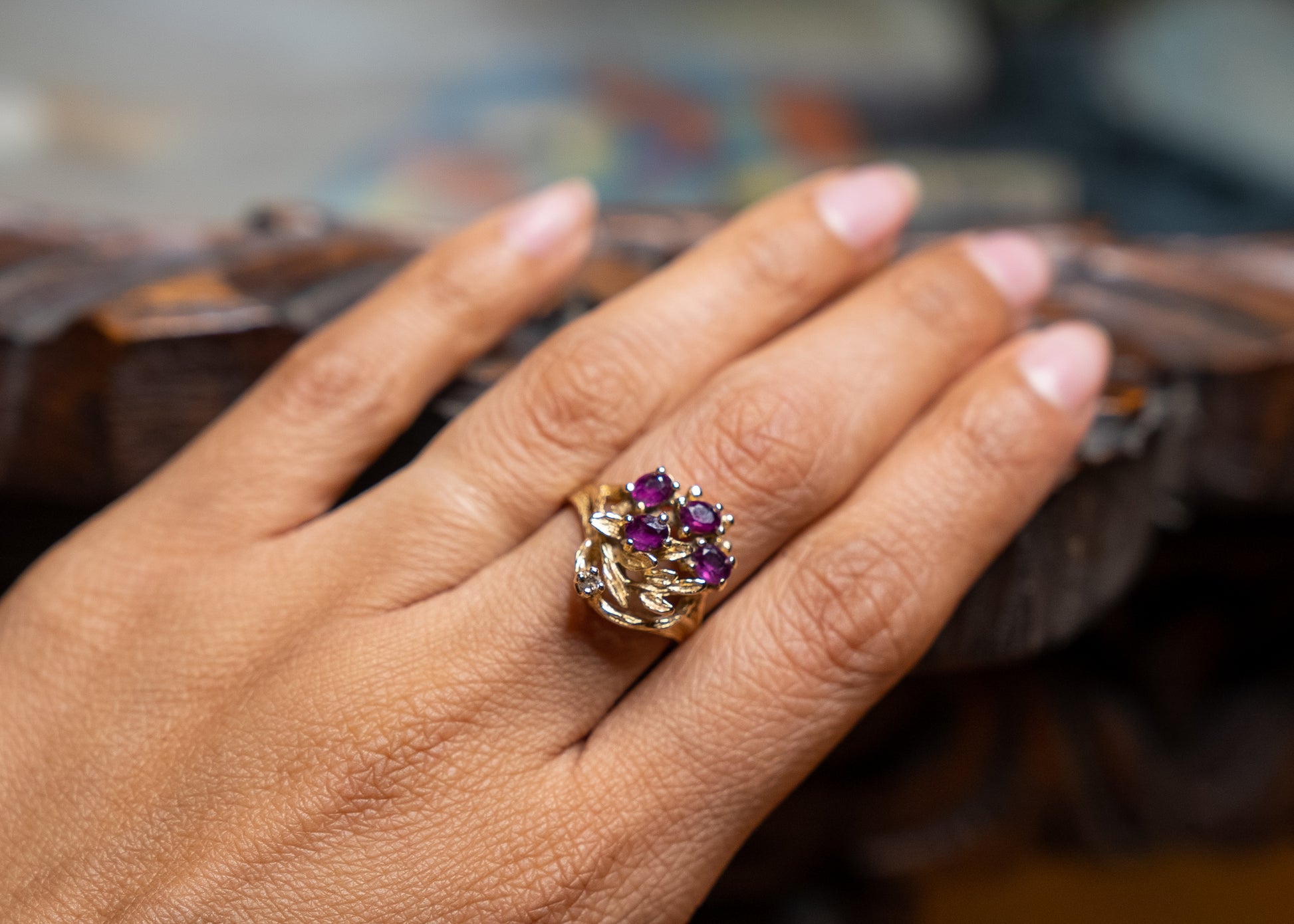 Add these cocktail ring with multi-ruby stones and a single diamond cluster. The leaves are giving a brutalist design, adding some texture to this 12k ring. The size on this ring is #6 and it weighs 4.5g. Add it to your collection :)