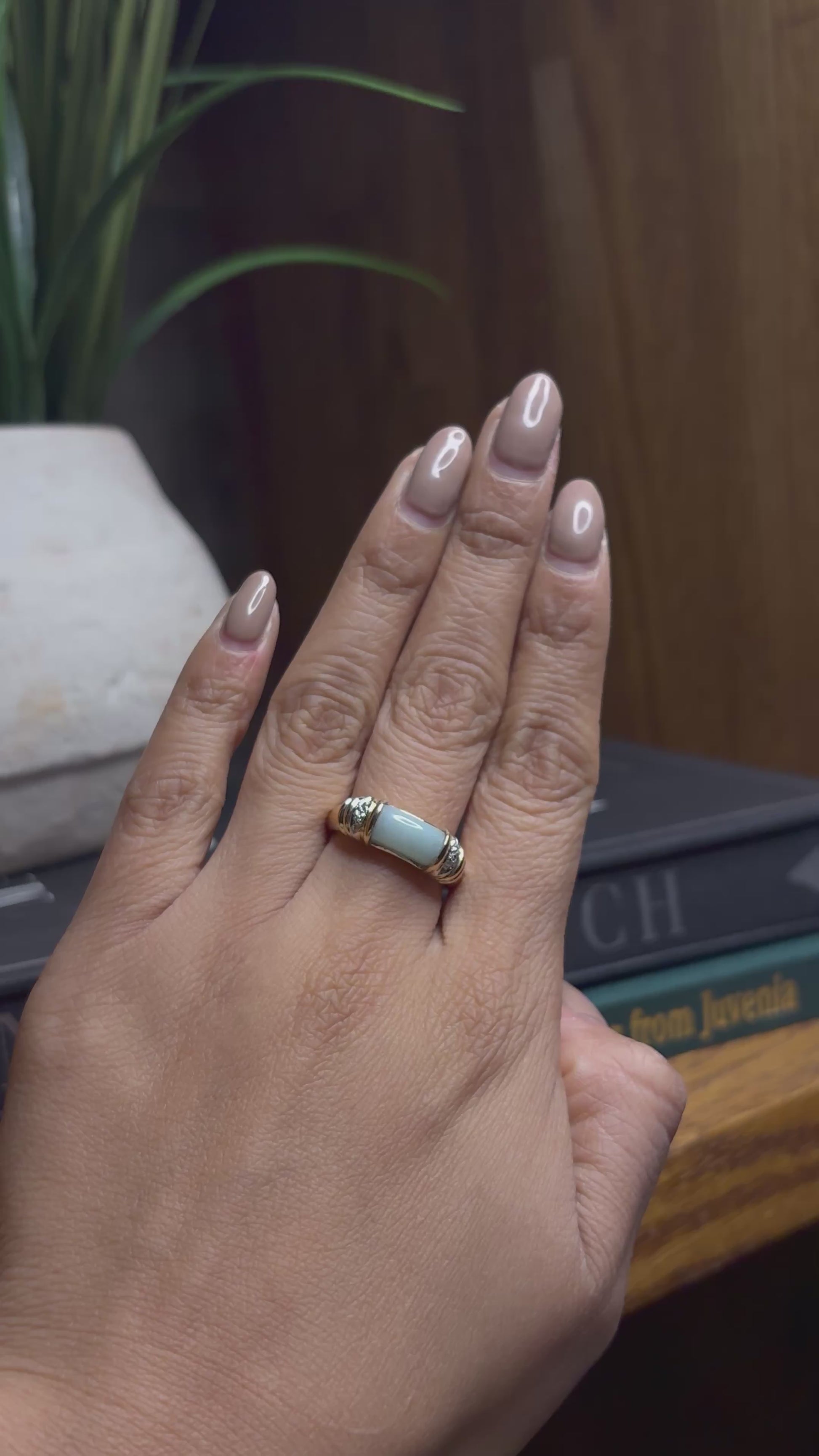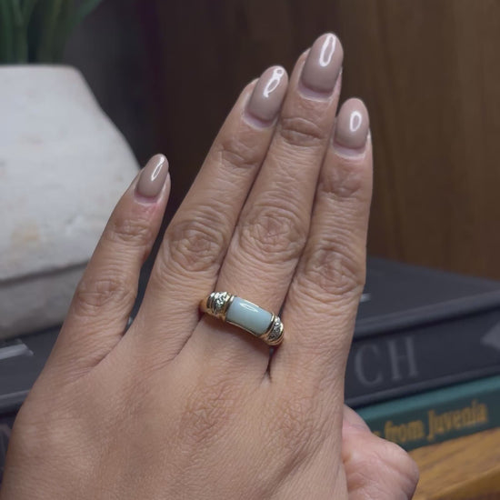 14k Jade Ring with a ribbed detailing on the sides with cluster cubic zirconias. This ring is a size 6.75 and it weighs 4.5 grams. This ring can be resized. Add it to your jewelry collection.