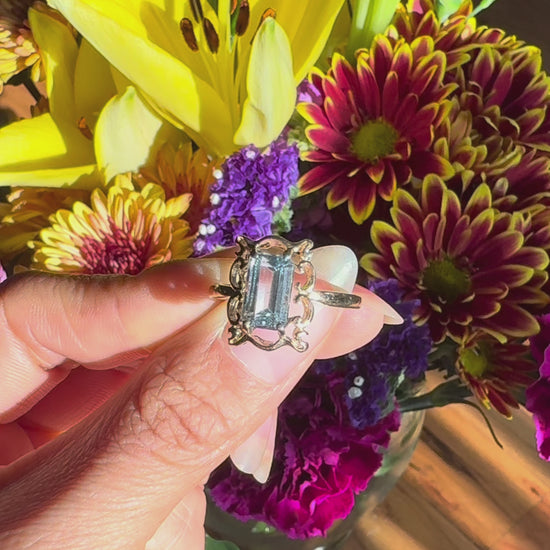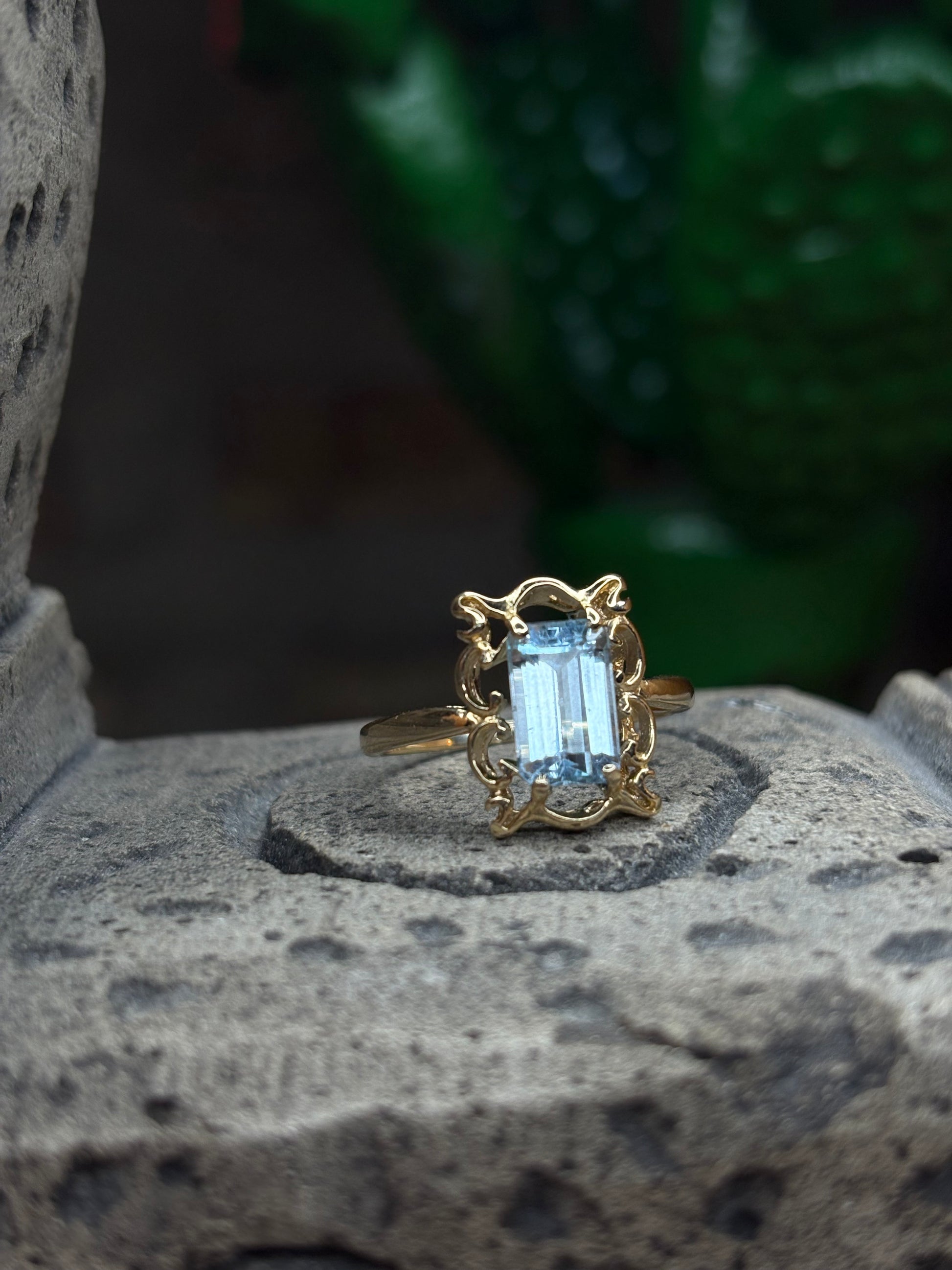 14k Helix-cut Aquamarine Ring. This stone is 1ct. Wrapped around a beautiful frame design. Add it to your collection.